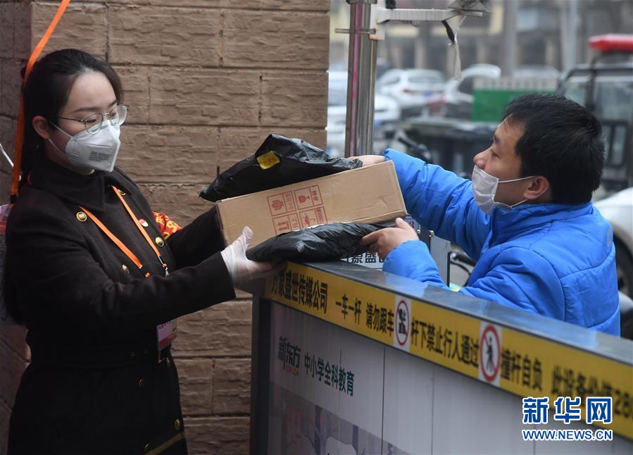 38日,在北京市中关村街道白塔庵社区出入口,“90后”志愿者王玥(左)接过快递员送来的社区居民的快递。  新华社记者 任超 摄