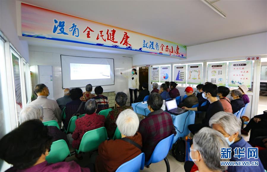 在福建省三明市三元区城关社区,来自三明市、区疾控中心和市中西结合医院、社区卫生服务中心的专业人员,与社区居委会工作人员组成医防融合团队,针对老年病开展健康教育(422日摄)。新华社发(三明市疾控中心供图)