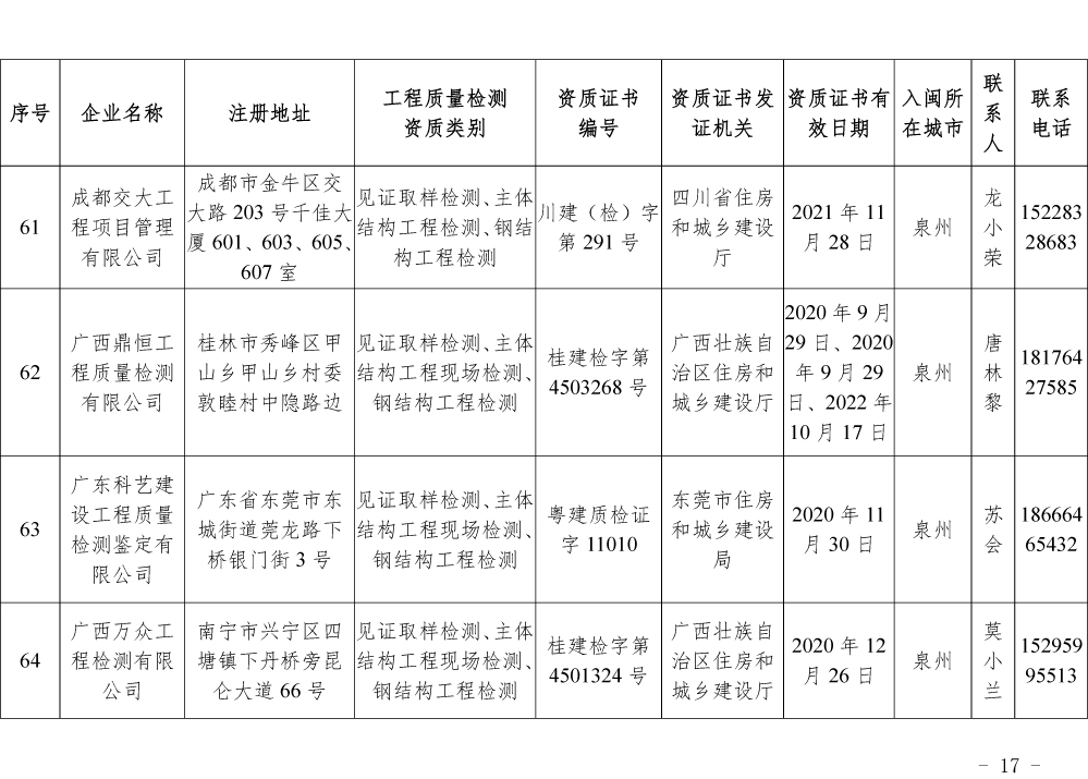 为更好的支持和服务我省房屋安全鉴定工作,截止5月底,共计74家省外建设工程质量检测机构已按照《建设工程质量检测管理办法》(住建部令第141号)有关规定,在我厅办理入闽承担检测业务备案手续,现将74家检测机构名单予以公布。