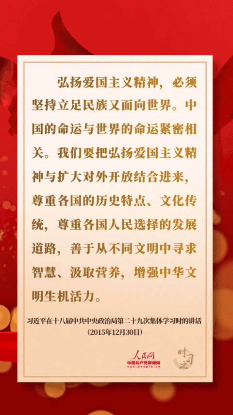 弘扬爱国主义精神,必须坚持立足民族又面向世界。中国的命运与世界的命运紧密相关。我们要把弘扬爱国主义精神与扩大对外开放结合进来,尊重各国的历史特点、文化传统,尊重各国人民选择的发展道路,善于从不同文明中寻求智慧、汲取营养,增强中华文明生机活力。