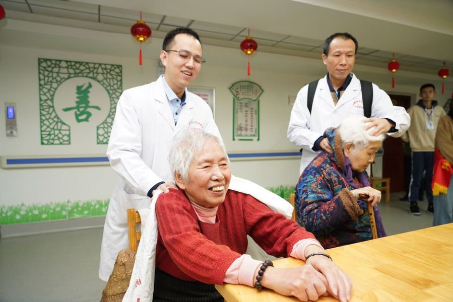 三明市盲协主席江华带领盲人志愿团队为社区老人按摩推拿。周志鸿 摄