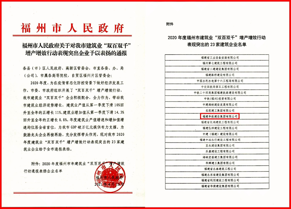 近日,为鼓励龙头企业再接再厉,充分发挥带头作用,福州市人民政府对在我市2020年度建筑业“双百双千”增产增效行动中,表现突出的23家建筑业企业给予通报表扬,福建华航建设集团荣登榜单。