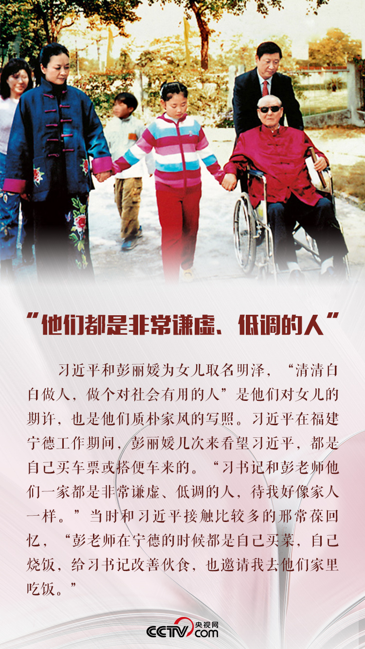 孝敬父母、爱护妻儿,习近平把家庭看得很重。他曾在接受媒体采访时说,“我有一个很幸福的家庭,夫妻俩都有自己的事业,但是对家庭都是共同去建设这个家庭。”