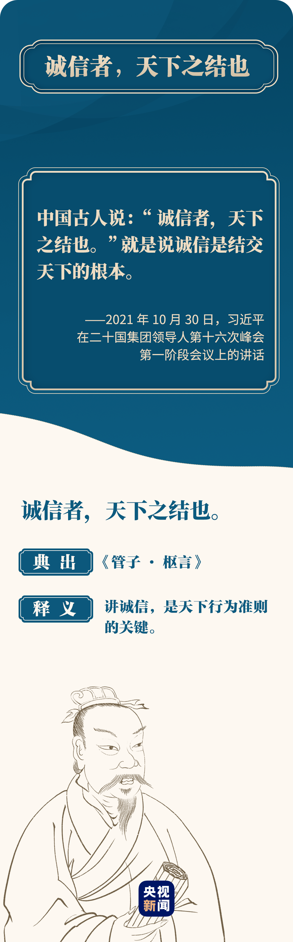 “中国古人说:‘诚信者,天下之结也。’”在10月30日的讲话中,习近平主席引用中国古语,深刻阐述了中国坚持对外开放的基本国策和以诚信结交天下的中国态度。