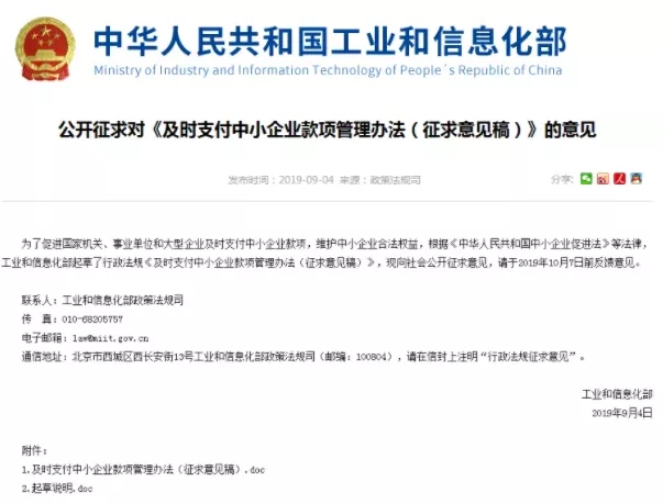 2021年9月,工业和信息化部中小企业局对《保障中小企业款项支付投诉处理办法(暂行)》公开征求意见。