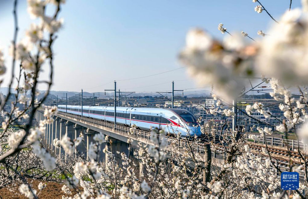 动车组列车在成贵高铁贵州黔西段行驶(2022年3月7日摄)。 新华社发(范晖 摄)