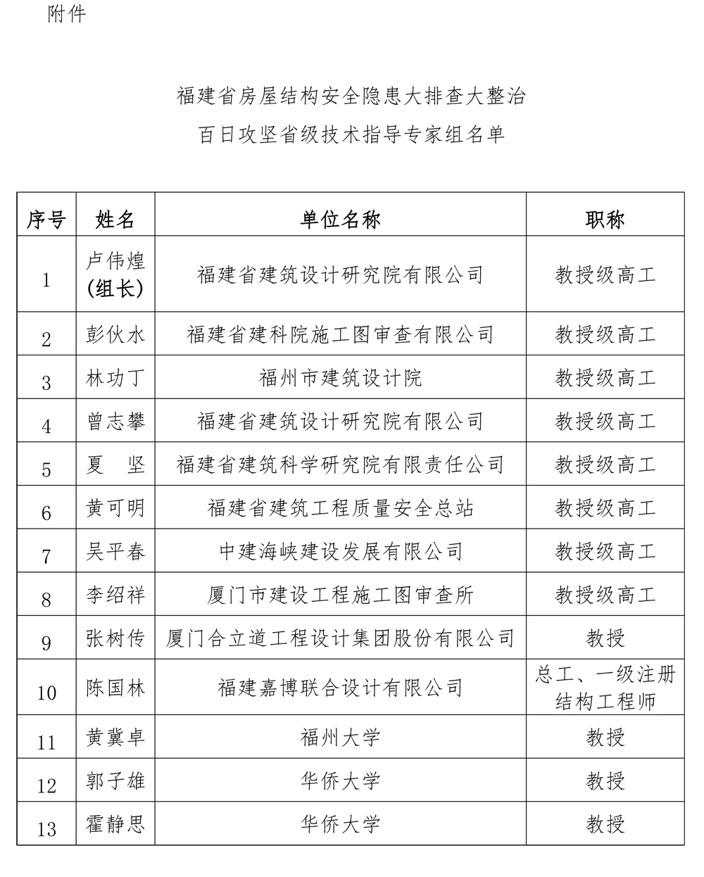 附件:福建省房屋结构安全隐患大排查大整治百日攻坚省级技术指导专家组名单