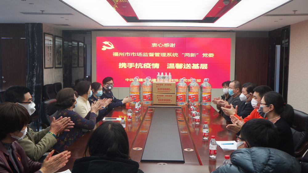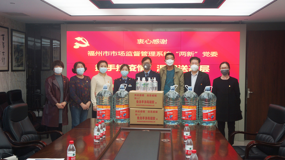 3月16日下午,福州市市场监督管理系统“两新”党委黄红霞主任一行莅临我司调研指导,并向我司赠送消毒水、免洗洗手液等防疫物品。