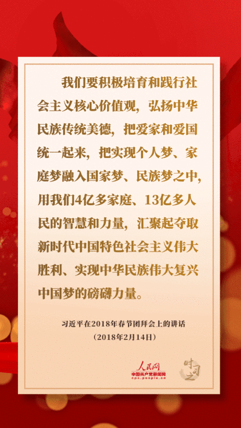 我们要积极培育和践行社会主义核心价值观,弘扬中华民族传统美德,把爱家和爱国统一起来,把实现个人梦、家庭梦融入国家梦、民族梦之中,用我们4亿多家庭、13亿多人民的智慧和力量,汇聚起夺取新时代中国特色社会主义伟大胜利、实现中华民族伟大复兴中国梦的磅礴力量。