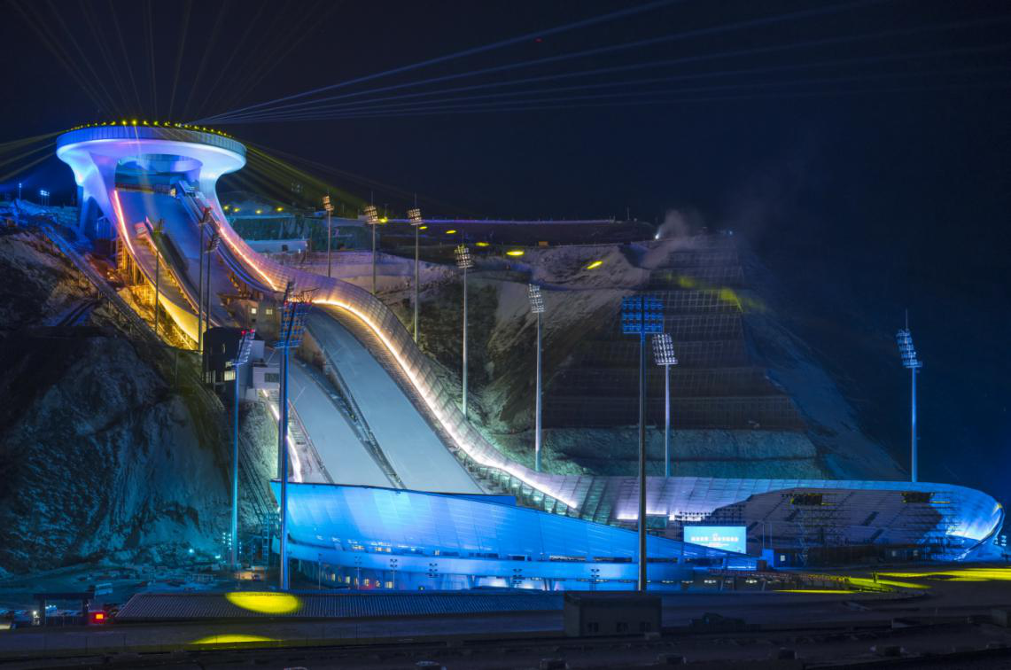 这是位于河北省张家口市崇礼区的国家跳台滑雪中心“雪如意”点亮效果。无人机照片,20201219日摄