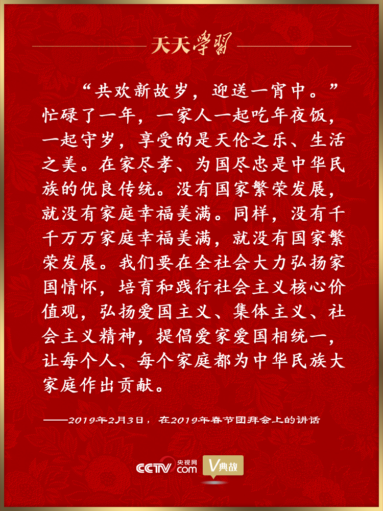 戊戌年腊月三十,恰逢立春,堪称双喜临门。习近平总书记在春节团拜会讲话中,借“共欢新故岁,迎送一宵中”,畅叙家国情怀:“没有国家繁荣发展,就没有家庭幸福美满。同样,没有千千万万家庭幸福美满,就没有国家繁荣发展。”