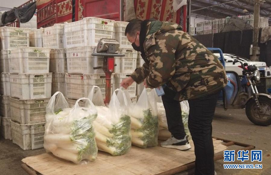 蔬菜供应商韩拴杰在山西省太原市河西农贸市场整理白萝卜(210日摄)。新华社记者 王皓 摄
