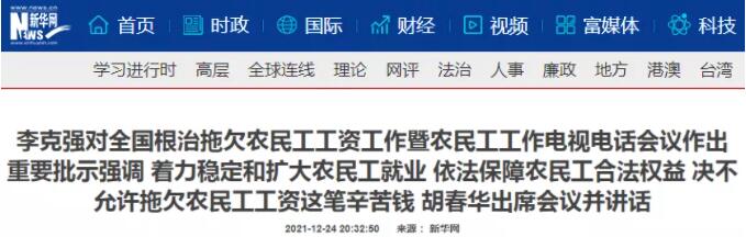 据新华社北京12月24日电 全国根治拖欠农民工工资工作暨农民工工作电视电话会议12月24日在京召开。中共中央政治局常委、国务院总理李克强作出重要批示。