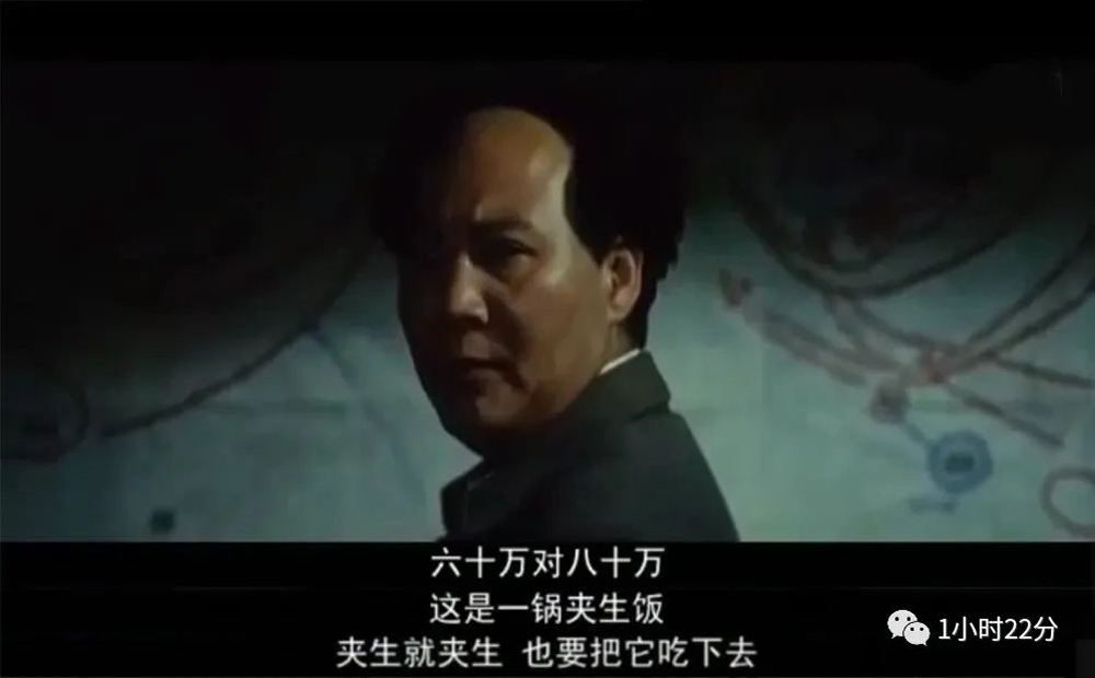 “所谓战略决战,简单说,就是赌国家的命运,赌军队的命运,这个赌字啊,很不好听,可又找不出一个更恰当的字来代替它,就是这么一回事,啪的一下押上去了,正是因为如此,事情临到了面前,又禁不住心扑扑地跳,哪有这个道理啊,心跳的什么呢?我们不怕燃烧,我们不怕白热化,我们不怕烫到这里烫到那里,我们的手不能发抖啊。六十万对八十万,这是一锅夹生饭,夹生就夹生,也要把它吃下去!”