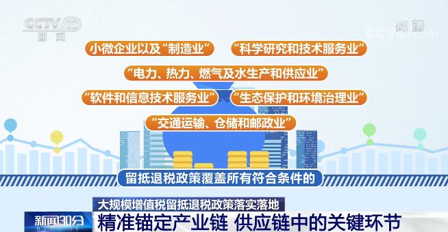 据介绍,今年实施的大规模增值税留抵退税政策与前期政策相比,主要聚焦小微企业和重点行业。留抵退税政策覆盖所有符合条件的小微企业以及“制造业”“科学研究和技术服务业”“电力、热力、燃气及水生产和供应业”“软件和信息技术服务业”“生态保护和环境治理业”和“交通运输、仓储和邮政业”,精准锚定国民经济运行和产业链、供应链中的关键环节。