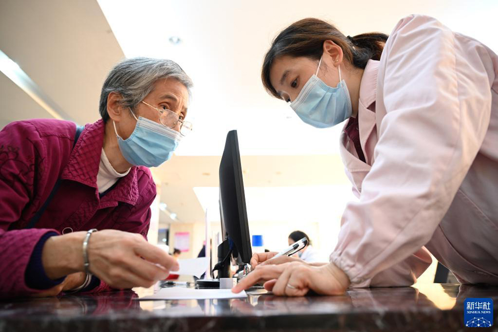福建省三明市第一医院医保办工作人员(右)向前来咨询药品报销问题的居民讲解相关政策(20201118日摄)。新华社记者 姜克红 摄