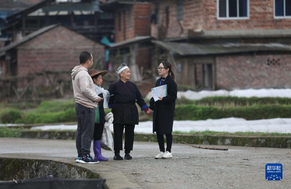 在广西柳州市三江侗族自治县良口乡南寨村,纪检监察干部(右一、左一)在了解惠农政策落实情况(2022324日摄)。新华社记者 黄孝邦 摄