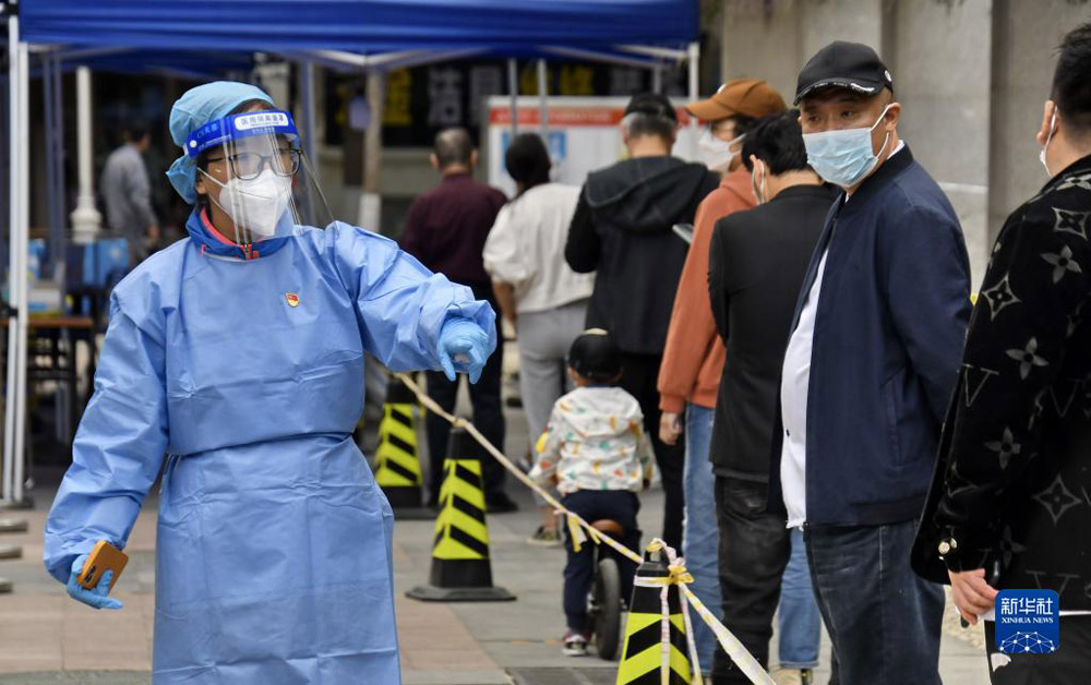 共产党员、北京八里庄街道机关干部张茜(左)在核酸筛查现场进行秩序维护(2022511日摄)。新华社记者 李欣 摄