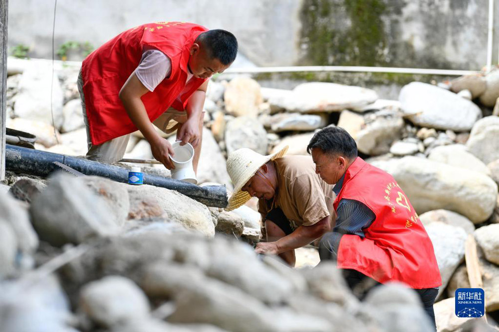 在贵州省黔东南苗族侗族自治州从江县刚边壮族乡银平村,党员志愿者帮助遭受强降雨袭击受灾的村民修整水管(202271日摄)。新华社记者 杨文斌 摄